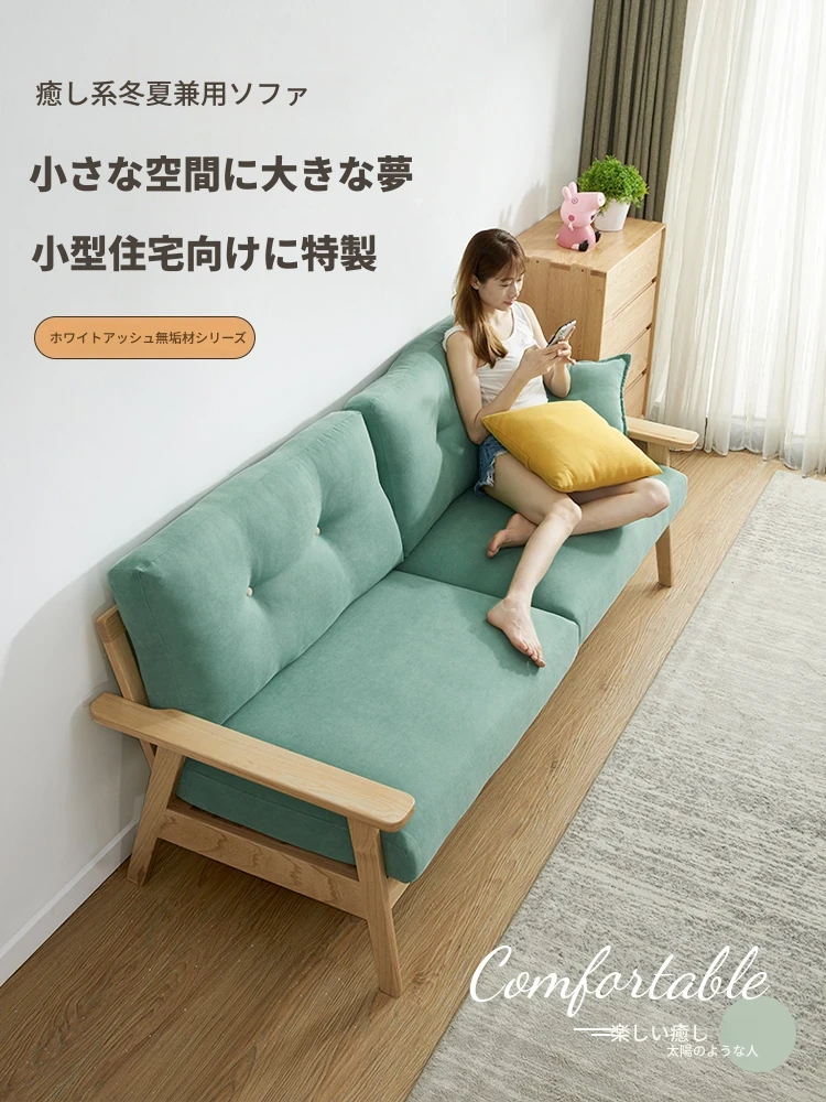 冬夏使える!お手入れ簡単な日本風実木製ソファ|小型リビングに最適なスノーにール素材の2人掛けアパート&ゲストハウス用