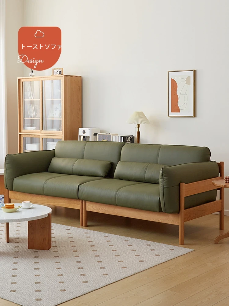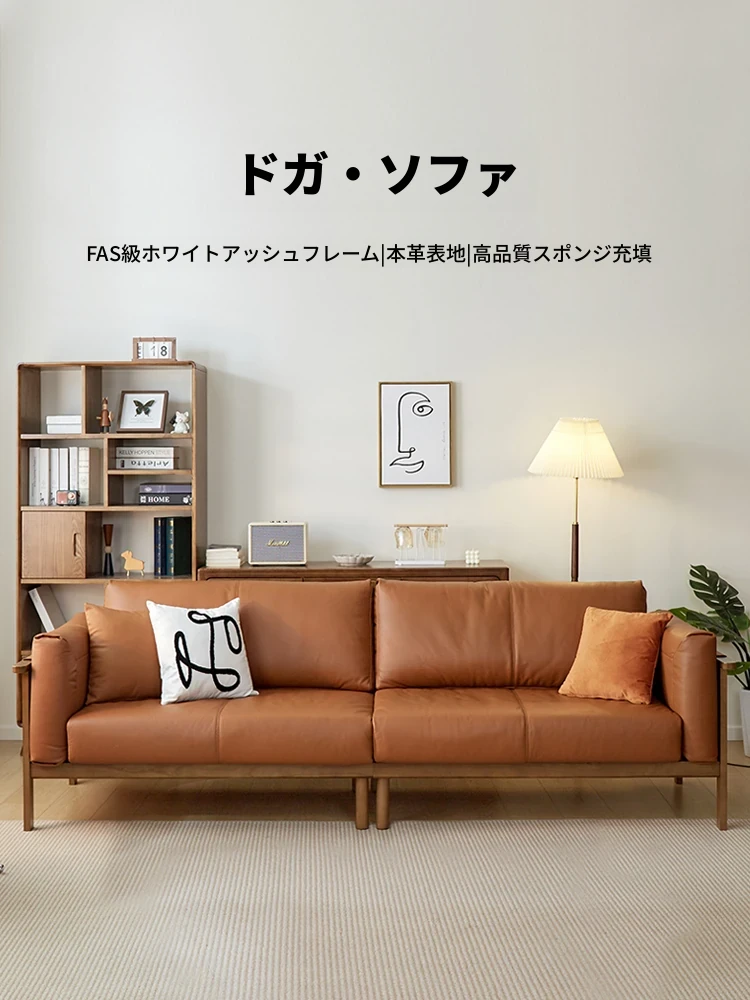 天然素材で魅了!日系桜の木 無垢材ソファ - 北欧風リビングにぴったり、高級本革使用のミニマリストデザイン