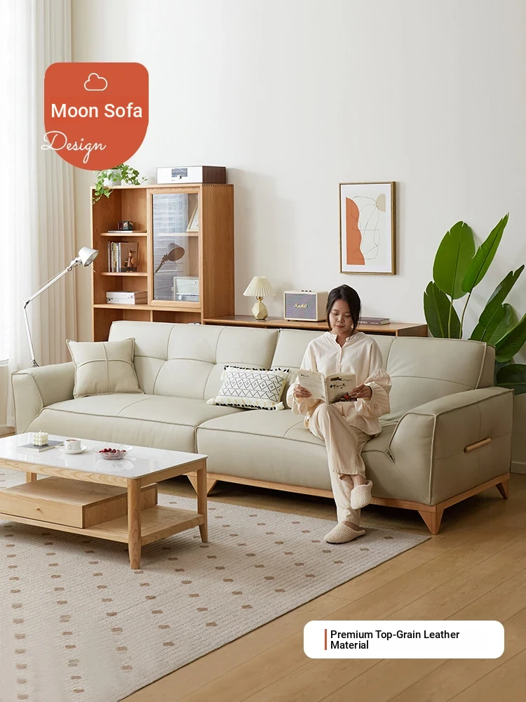 Japanese Solid Wood Compact Living Room Sofa - Modern Nordic Genuine Leather Couch for Three - Premium Top-grain Leather