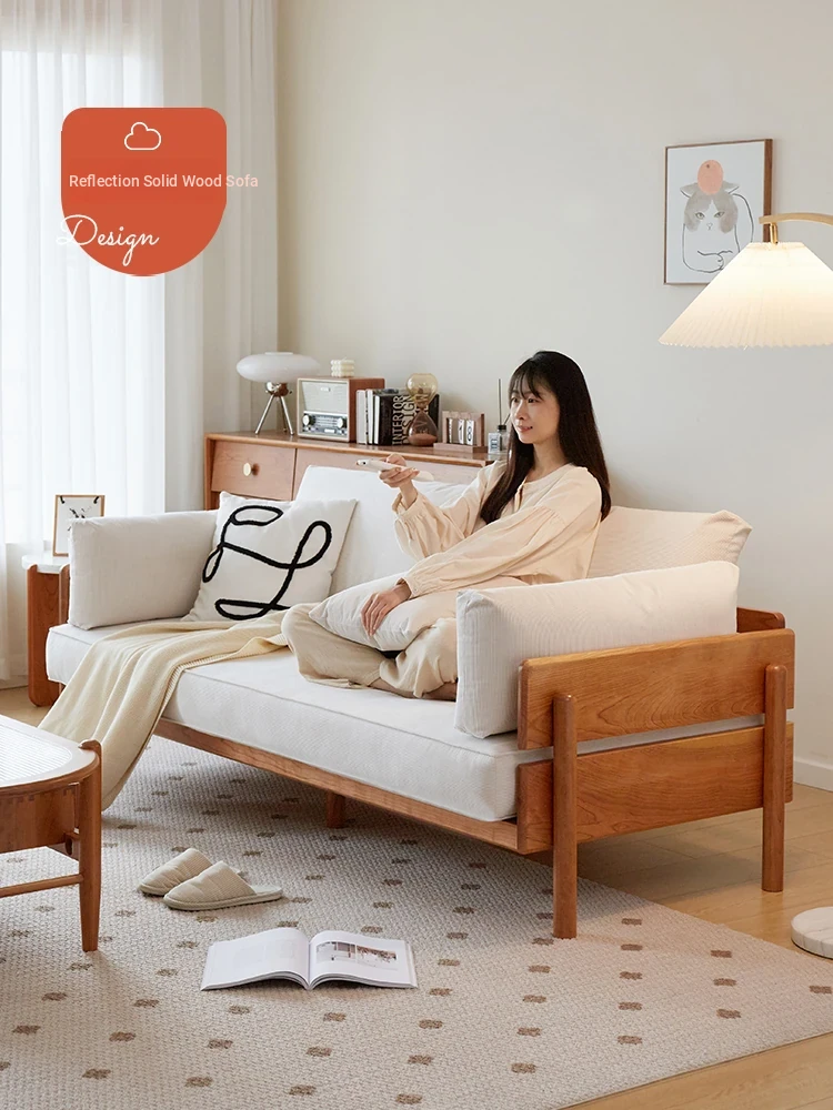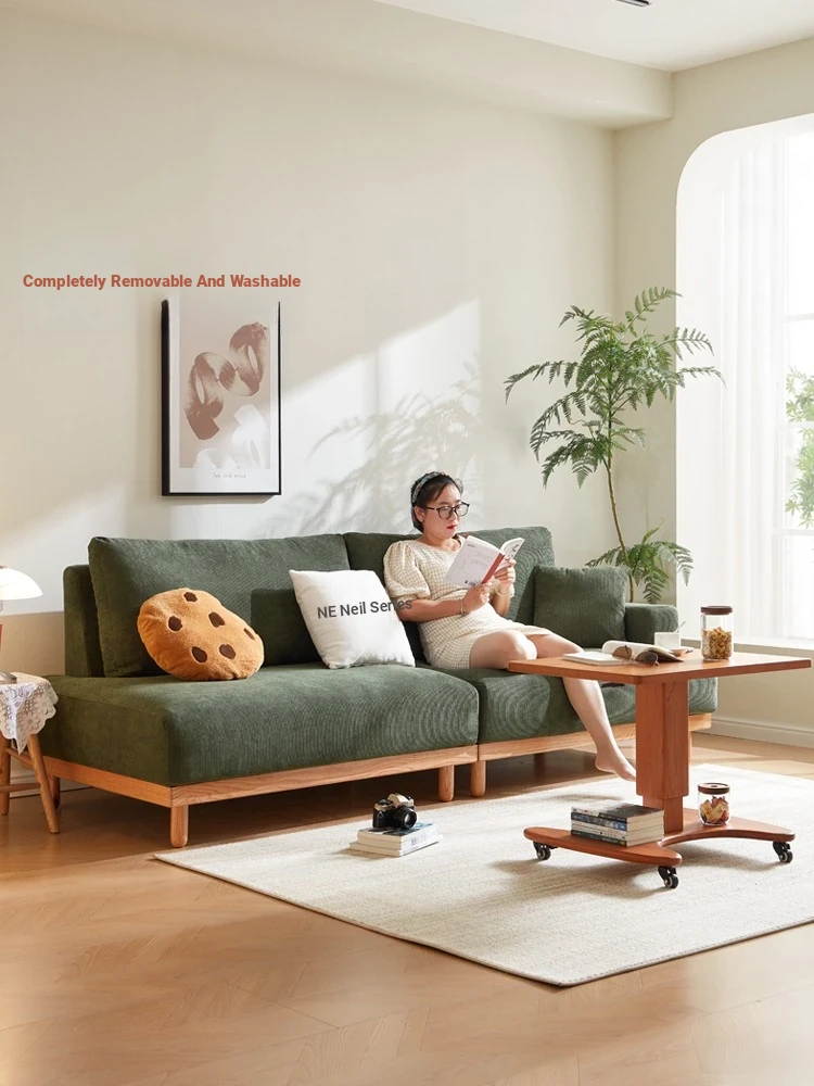 Japanese Cherry Wood Solid Small Living Room Sofa - Cozy 3-Seater with Removable Corduroy Fabric for Easy Cleaning