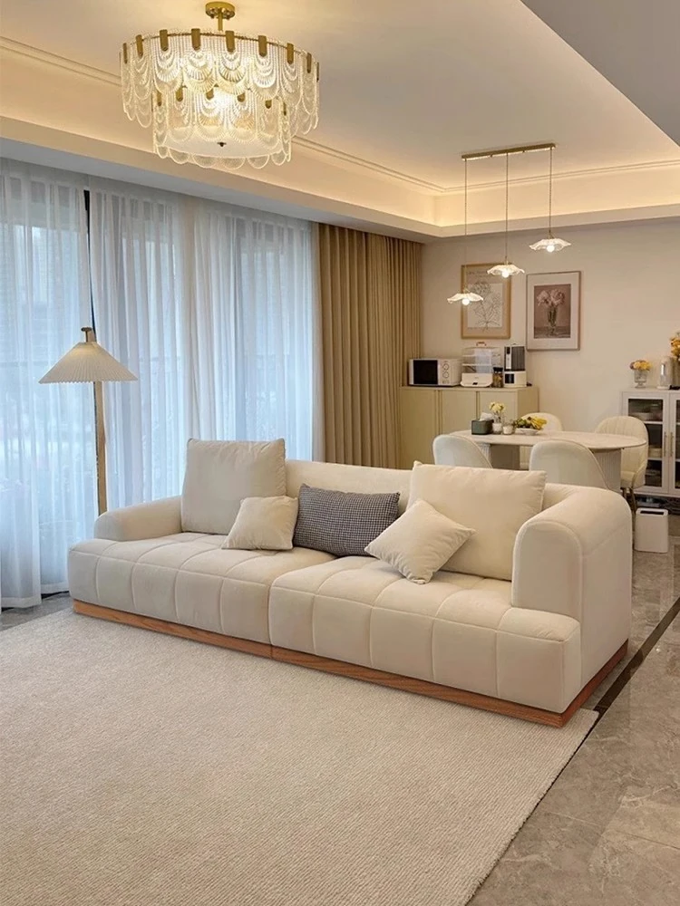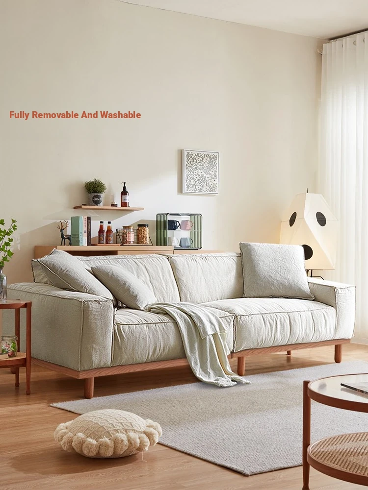 Scandinavian Solid Wood Cream Fabric Sofa - Removable and Washable Tofu Block Design, Trendy Choice for Small Spaces, Premium Cotton and Linen, Sleek Straight Line Style