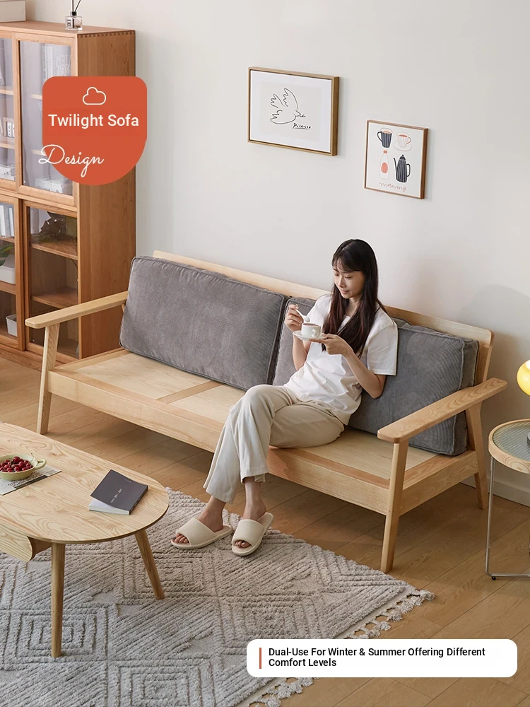 Japanese-Style Dual-Season Solid Wood Sofa for Small Living Rooms - Compact 2-3 Seater in Scandinavian White Ash Wood Design
