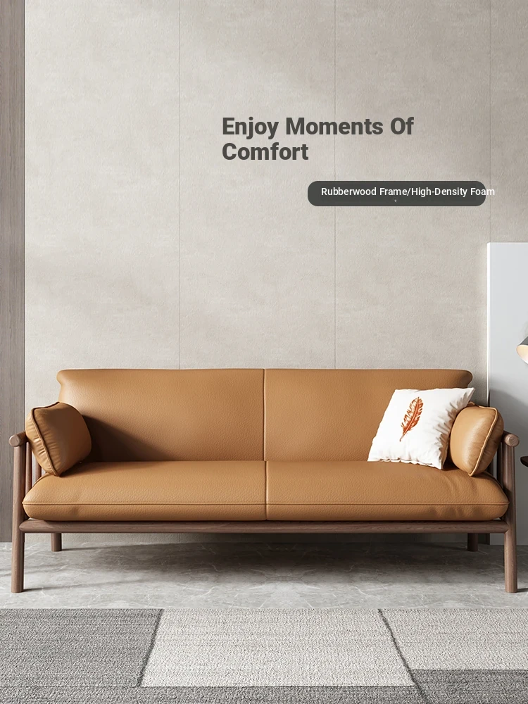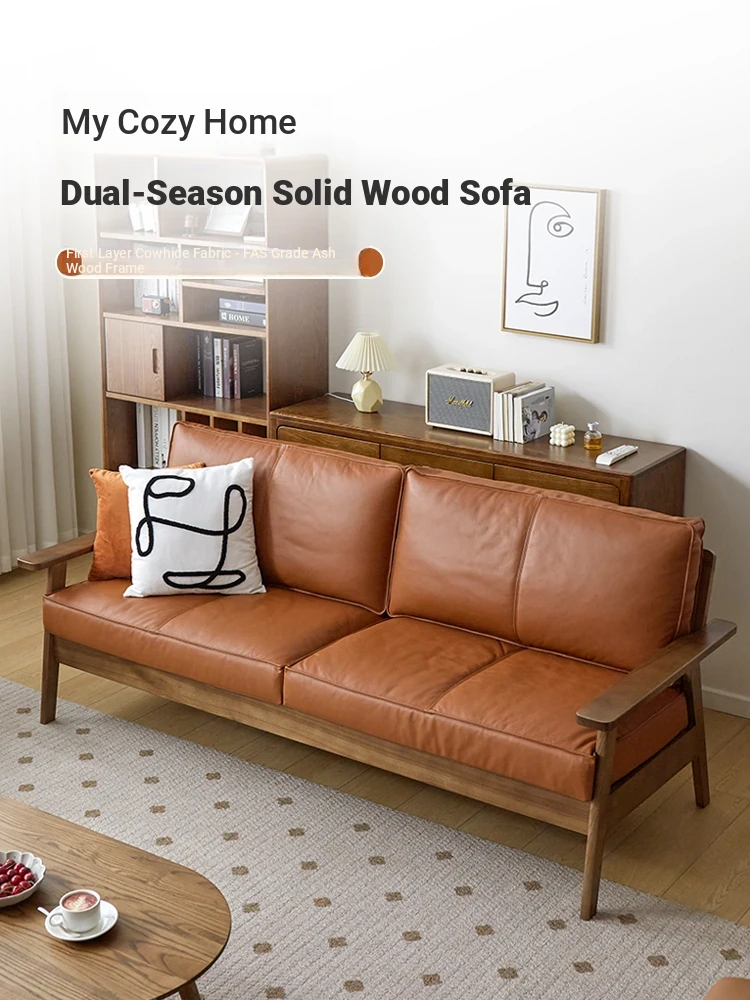Versatile Solid Wood Sofa - Japanese Style Small Living Room Couch for All Seasons, Nordic Genuine Top-Grain Leather Three-Seater