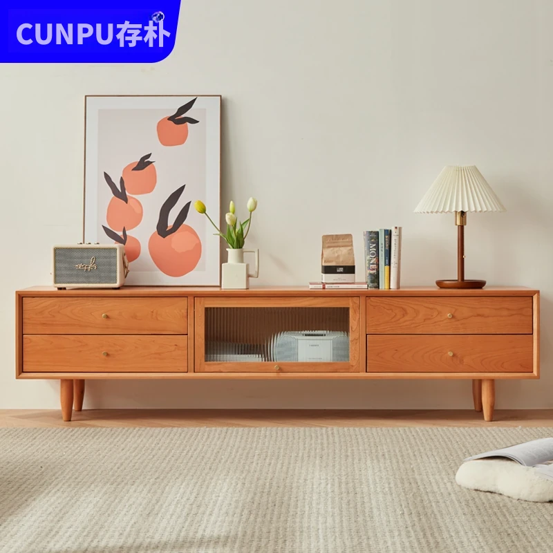 北欧風天然木製ダイニングサイドボード - チェリーウッドカラーの多目的収納キャビネット、家庭用カフェキャビネット兼食器収納。