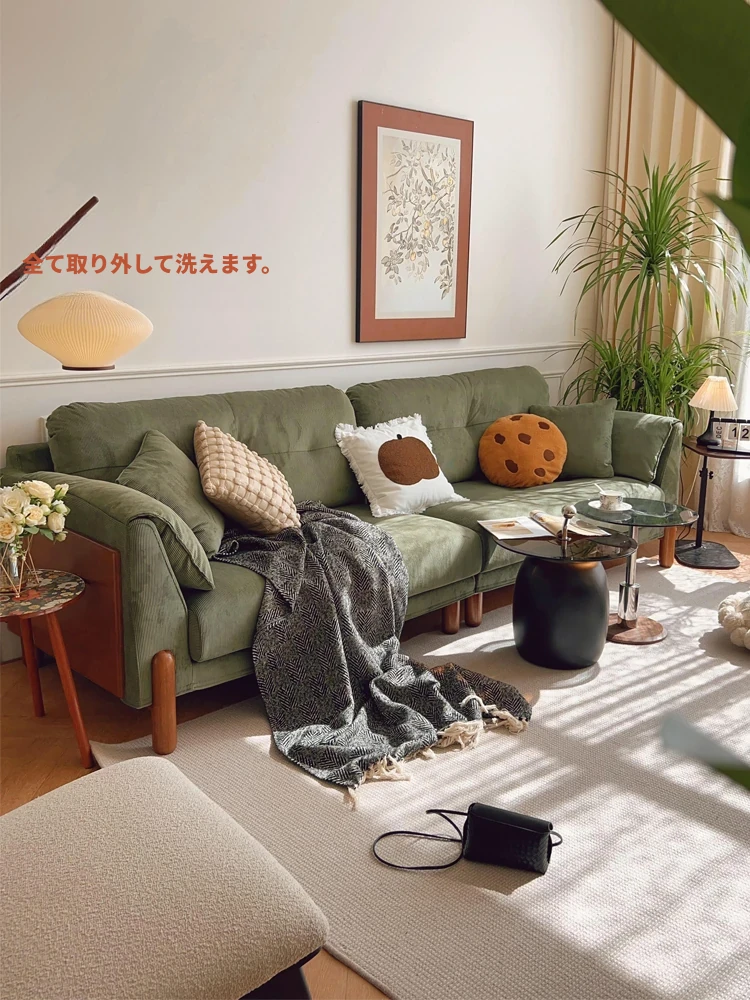 フレンチヴィンテージスタイルの布製ソファ、北欧風のリビングにぴったり!コンパクトな小型住宅向け、レトロなグリーンの木製ソファは取り外し可能で洗えるので、いつでも清潔に保てます。おしゃれで機能的な空間を演出!
