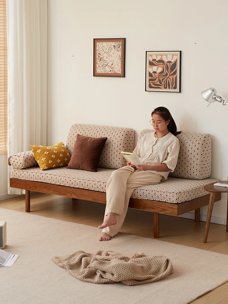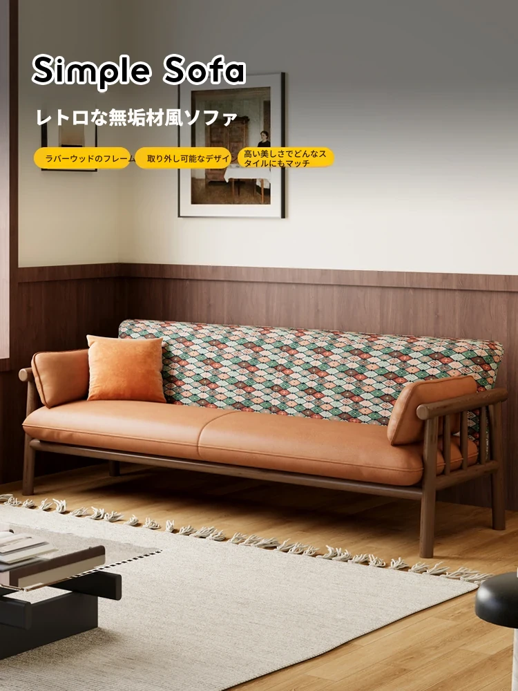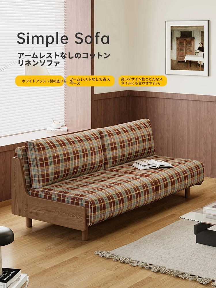 北欧風無肘木製ソファー 小型リビングに最適!1.5Mのレトロチェック柄ファブリックソファは、取り外し可能で洗濯も簡単。おしゃれで機能的な空間を演出します!