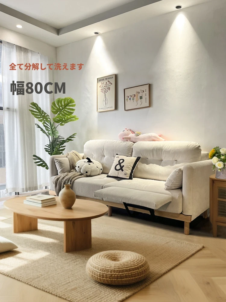 北欧スタイルの80cm幅・スリム機能ソファ!電動リクライニングで快適さを追求。小型住宅に最適なクリーミーな原木デザイン。洗えるファブリックでお手入れ簡単!おしゃれで実用的な一品です。